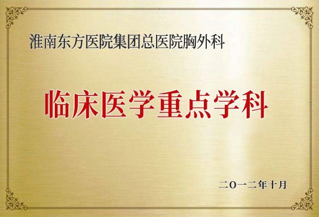 淮南东方医院集团胸心外科医疗中心现拥有总院、肿瘤医院、凤凰医院三个病区,系淮南市临床医学重点学科,拥有床位70张,医生18人(主任医师4人,副主任医师2人),技术力量雄厚,学科发展规范。经过多年的不断发展,在微创肺外科、微创食管外科、心脏大血管外科等方面均处于省内先进,市内领先的水平。2021年获得“安徽省胸外科ERAS区域示范病房”。