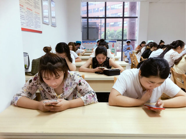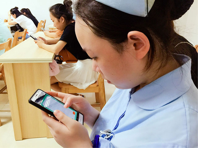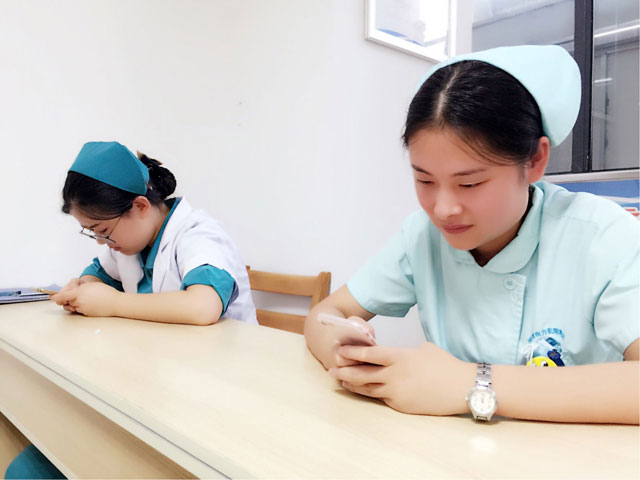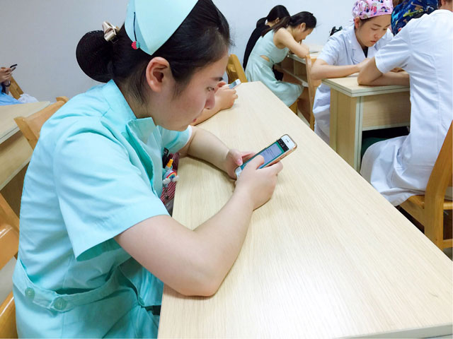 时间一到,参加考试的护士们从口袋里拿出手机,轻松开始做起试题。
