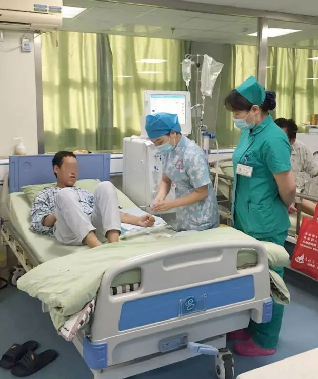 总院血透室护士长介绍,血液透析是慢性肾衰尿毒症病人赖以长期生存的一种重要的治疗手段,而动静脉瘘则是目前大部分血透患者的血管通路,其重要性和安全性可想而知,俗称“生命线”。长期血液透析的患者面临了一个很大地问题就是自身血管条件问题。以往的锐针穿刺法容易使血管发生渗血、动脉瘤形成、血栓等并发症。病人皮肤损伤大,痛苦多。钝针扣眼穿刺法不仅可以增加内瘘的美观性,降低并发症的发生率,对内瘘形成有效的保护,提高透析治疗效果,保证良好的预后,还可以减少普通穿刺对患者造成的痛苦和焦虑。