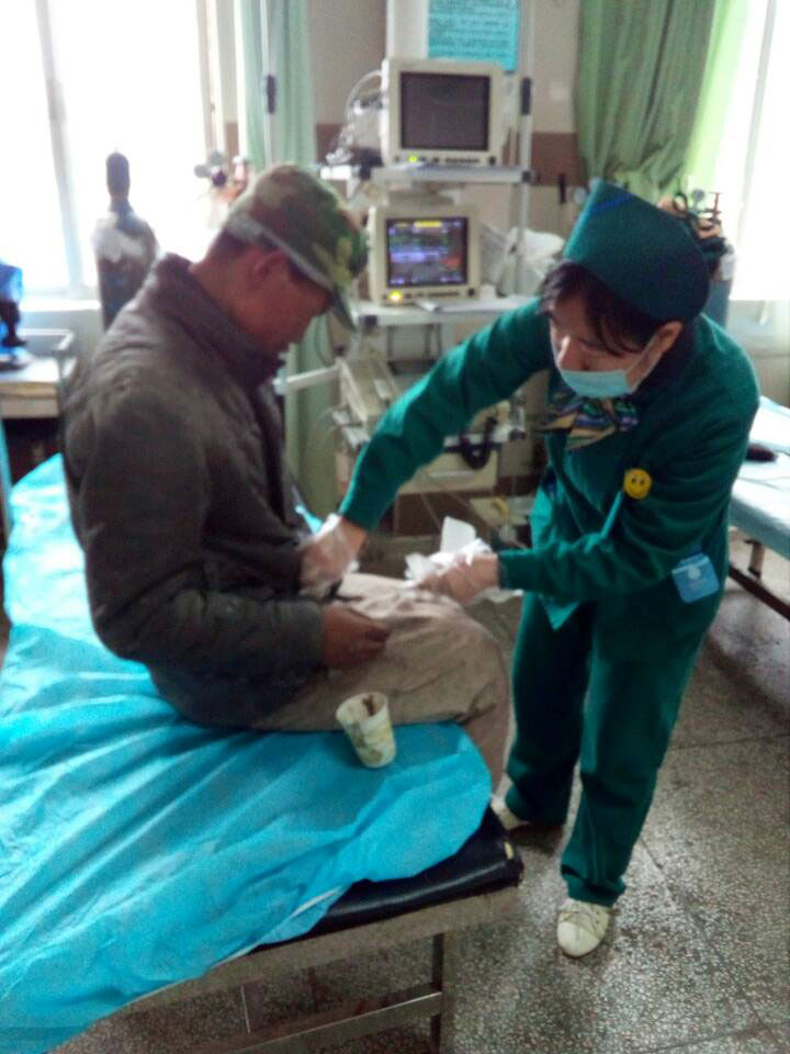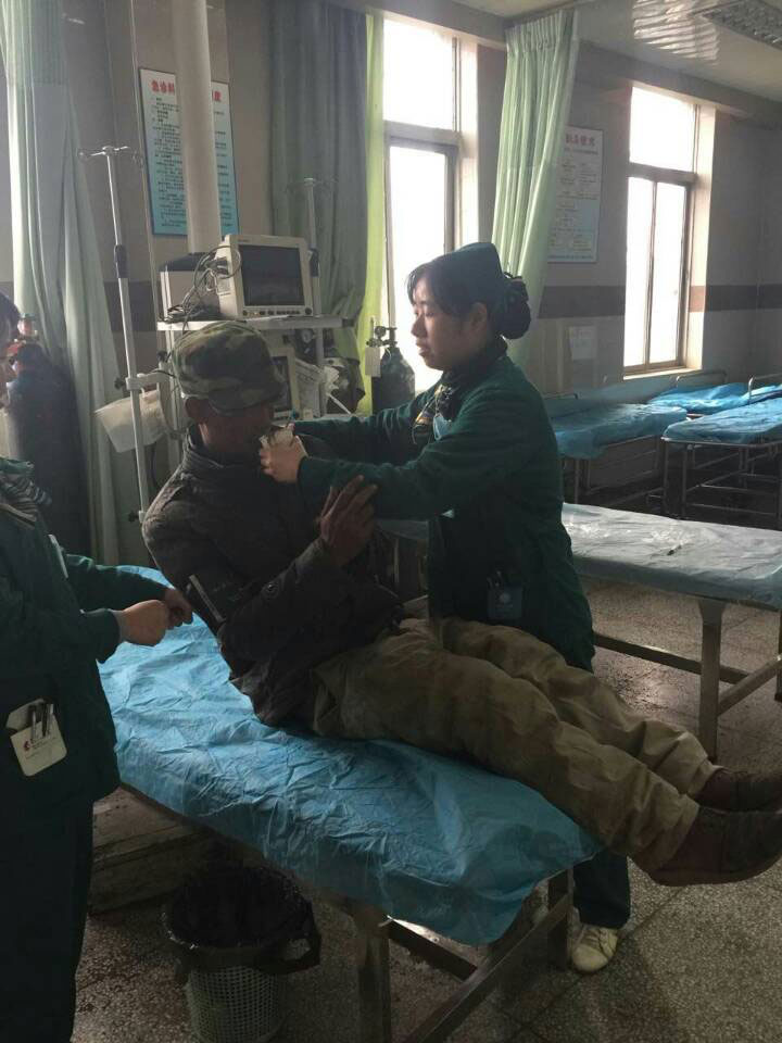 我们把“病人”扶入抢救室,首先测量了生命体征,比较平稳,外科李克磊医生查体 :右侧头部凹陷是陈旧性的,暂不知原因,口唇及手部的擦伤已给予处理,腰背的陈旧性伤口已结痂。熊安民主任知道后,在急救室询问病情,要求我们做好接诊工作,及时治疗,妥善安置,及时认真做好记录,必要时使用绿色通道。