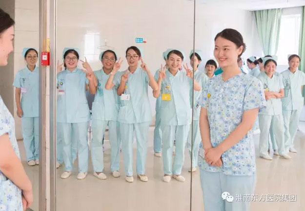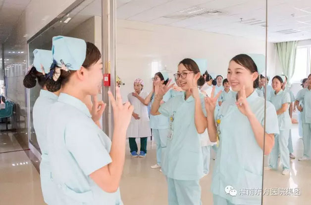 随后,刘主任领着我们走向康复科治疗区,听刘主任说,那里面有一个大大的镜子,照过后可以令人容光焕发,不知道是不是真的有这么神奇。到了镜子前,我们才恍然大悟,原来刘主任卖了一个大关子,能令我们容光焕发的不是镜子,而是我们自己,是我们发自内心的微笑。刘敏主任说:在护理工作中,勤勤恳恳、兢兢业业很重要,但是保持微笑,用一颗真心对待病人同样很重要,工作中我们要做到微笑服务,所以现在开始,练习微笑。一开始,大家都很羞涩,不愿意就这么大庭广众之下对着镜子尴尬的笑,你推我攘的,后来,刘主任仿佛看透了我们的心思一般,亲切的说:“来,我先笑给大家看”,然后点名表扬谁的笑容最美,谁最会笑,渐渐地大家都放开了,纷纷对着镜子笑了起来,原来,笑真的可以让人变美……