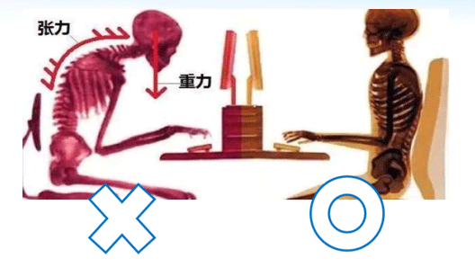 在坐的时候一定要腰部挺直,当然了挺直长时间会觉得比较累,我们也可以在腰部后方垫一个垫子,帮助支撑,但是要保证腰椎是一个比较直立的状态,而不是像下面图中左侧那样,像一个大虾米一样弓在那。