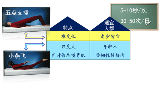 针对腰背肌的锻炼,给大家推荐两个动作:“小燕飞”和“五点支撑”。