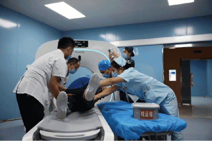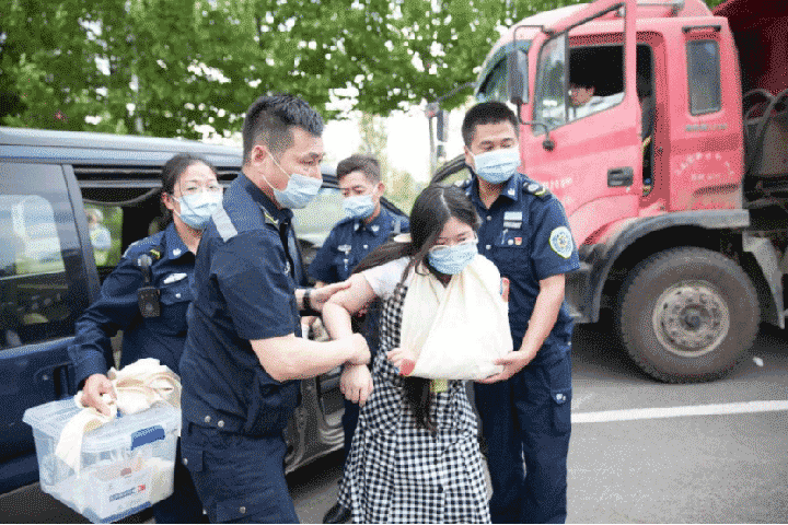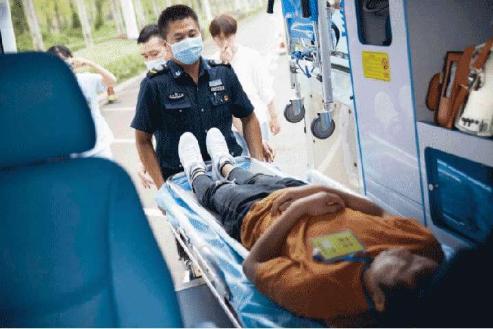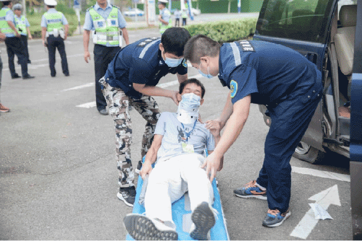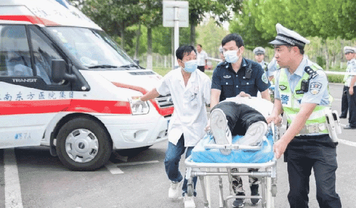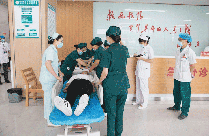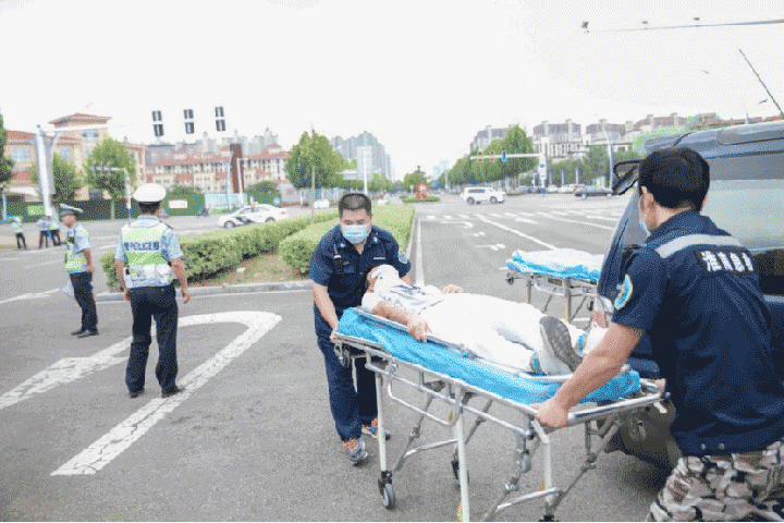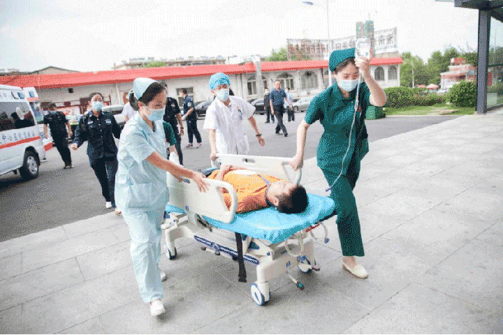 随后,救护车在警车的护送下到达,抢救小组快速将伤员抬下车并转移到分诊台,急诊医护人员迅速为伤员检查生命体征及初步伤情判断。