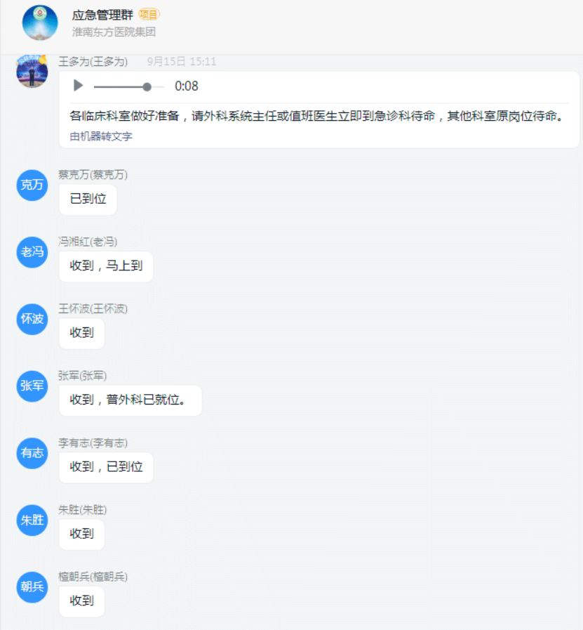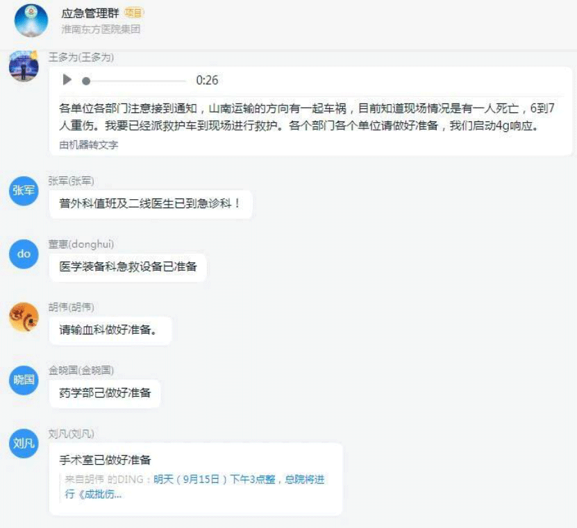 应急总指挥王多为院长接到消息后,通过钉钉立即向应急小组成员发送消息,召集相关科室人员向临时指挥部(急诊科)聚集。