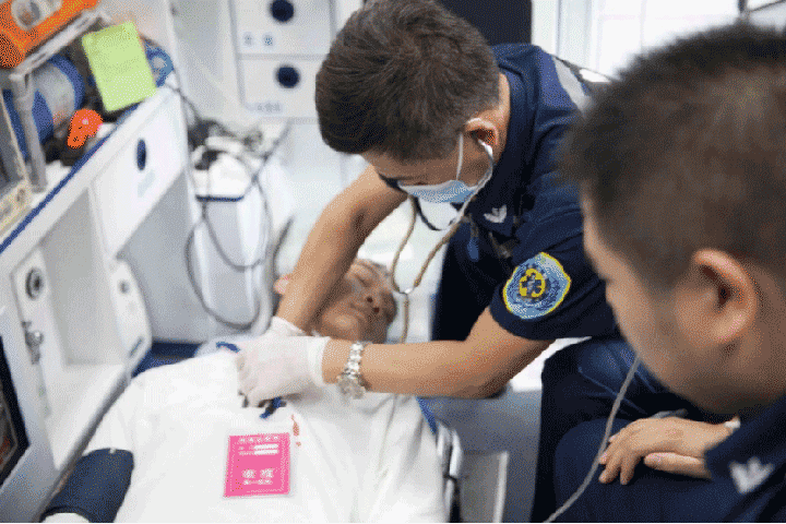 救护车抵达现场后,在交警的配合下将伤员从车内抬出,对伤情较重的伤员立即采取急救措施并转移上救护车。