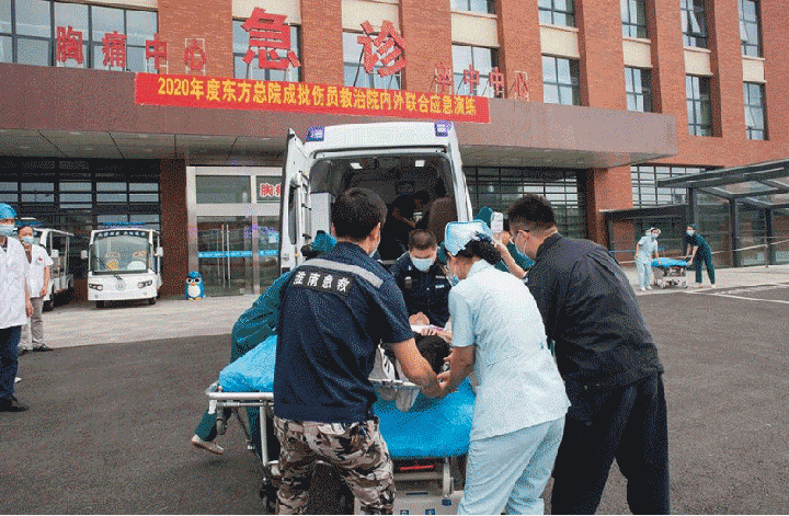 为加强东方总院应对重大突发事件的快速反应能力,保障区域内发生重大突发事件后的医疗救援质量,完善院内外应急协调机制,保证在紧急情况下,能做到调度有方,出诊及时,救治有力,措施得当。9月15日下午,由王多为院长部署,詹一朝副院长统一安排,医政部胡伟部长、急诊科熊安民主任居中协调,在交警支队、消防支队、120急救指挥中心等单位的支持配合下,急诊科、普外科、骨科、耳鼻喉科、保卫科、医学装备科、影像中心等二十多个科室的协同下,总院进行了2020年度成批伤员救治院内外联合应急演练。