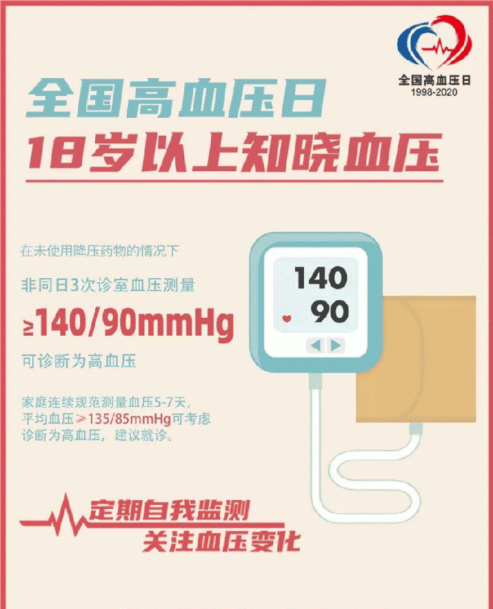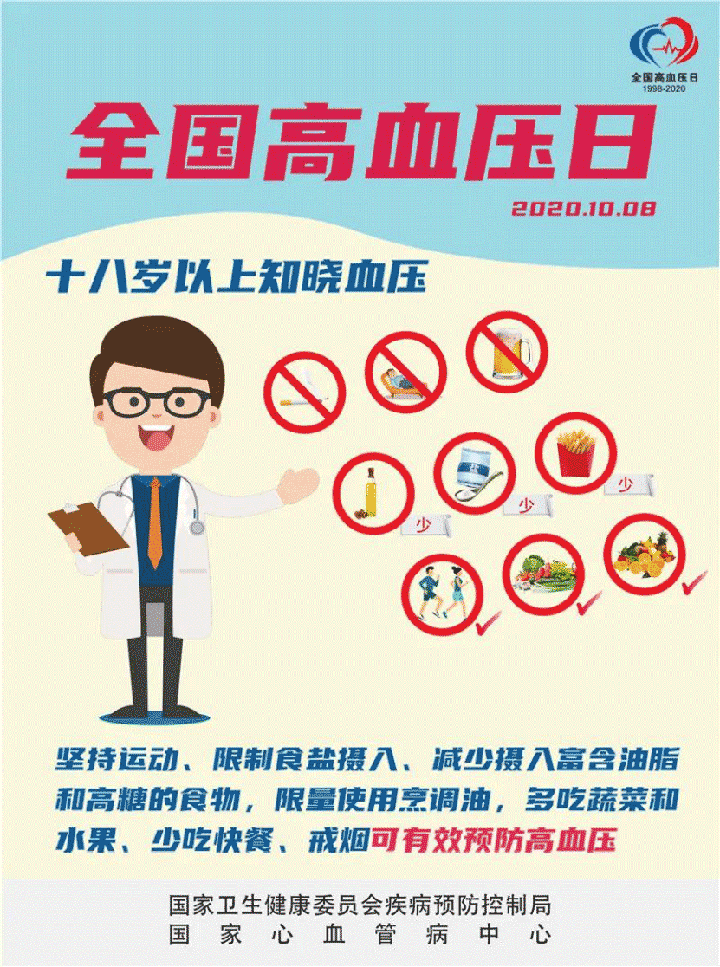 2020年10月8日是第23个全国高血压日,为贯彻落实《健康中国行动(2019—2030年)》有关要求,推进心脑血管疾病防治工作,国家卫生健康委疾控局确定今年的宣传主题为“18岁以上知晓血压”,旨在促进18岁及以上成人定期自我监测血压为重点,开展高血压防治健康教育和科普宣传,控制高血压危险因素,指导群众做好自我血压管理,切实提高高血压知晓率、治疗率和控制率。
