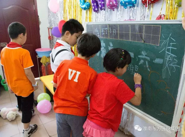志愿者们纷纷融入到福利院的小朋友中间去,与他们交流玩耍,有的教孩子们玩自己带来的玩具,有的弯下腰来、蹲在地上和孩子们交流,抚摸他们可爱的小脸蛋,还有的少先队小志愿者和福利院的孩子一起在小黑板上互相写着自己的名字,交换着彼此的趣事,孩子们的脸上都露出了天真可爱的笑容。虽然时间短暂,但是开心的笑容绽放在每一个孩子的脸上。