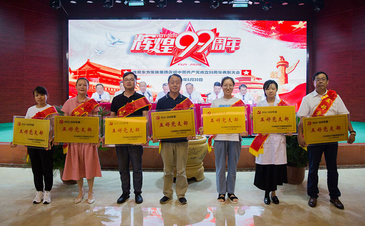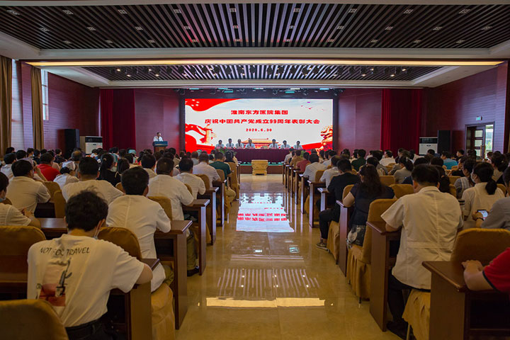 6月30日下午,淮南东方医院集团在总院多功能厅召开2020年庆祝中国共产党成立99周年暨先进集体和先进个人表彰大会,医院集团党委书记、董事长江鸿方、集团党委副书记、总院党委书记朱兴林、集团董事、总院院长王多为、集团董事、总经理江永强、集团党委副书记、纪委书记陈彬、集团党委委员、肿瘤医院院长李永安、集团董事、党委副书记王智、集团董事、谢一医院院长谭祥以及全集团受表彰的红旗党支部、五好党支部、模范共产党员、优秀党务工作者、党风廉政建设先进个人、预备党员和党员代表等近300人参加了此次大会。