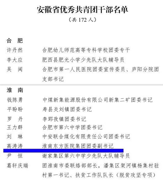 近日,省团委下发《共青团安徽省委关于表彰 安徽省五四红旗团委(团支部)、安徽省优秀 共青团员、安徽省优秀共青团干部的决定》(皖青〔2021〕号)文件,对安徽省五四红旗团(工)委、安徽省五四红旗团(总)支部、安徽省优秀共青团员、安徽省优秀共青团干部进行了表彰,淮南东方医院集团团委副书记、凤凰医院胸心外科主任高涛涛荣获“安徽省优秀共青团干部”称号。