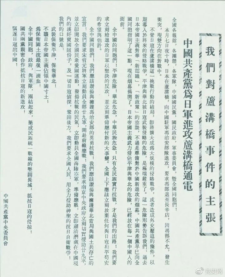 7月8日 中共中央发出《中国共产党为日军进攻卢沟桥通电》,指出:只有全民族实行抗战,才是中国的出路!号召全国同胞、政府和军队团结起来,筑成民族统一战线的坚固长城,抵抗日本的侵略。北平、天津、保定等地的人民群众和共产党领导的群众团体,纷纷起来支援第二十九军的抗战。全国人民也掀起抗日救亡、支援前线的热潮,给前方将士以巨大鼓舞。7月14日,中共中央军委命令红军做好开赴前线的准备。
