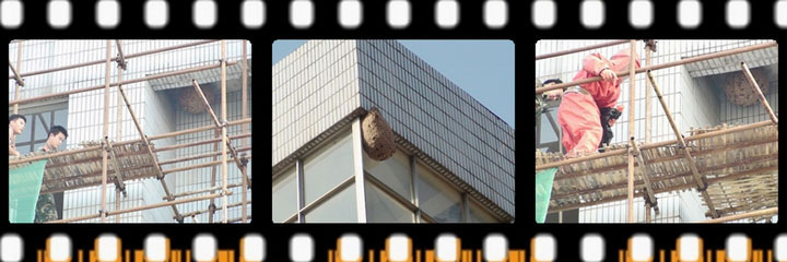 三个大马蜂窝,个个赛似脸盆大,分别悬挂在东方总院住院部六楼的两角和一个靠近马路的花园内,成千只马蜂就在人群稠密的地点“驻扎”着,这可让工作和生活这里的人不淡定。有心赶走这些不速之客,可是蜂窝太大,马蜂太多,一不小心就会招来不测。无奈之下,人们选择了拨打119,让消防官兵们来帮忙。 接到报警后,消防官兵迅速出警,于10月8日下午三点开始,对马蜂们进行了驱赶。消防车预备,在其它同志的协助下,一位消防兵全身防护服,小心翼翼地爬到住院部六楼外的脚手架上,手持杀虫剂,朝着蜂窝一阵喷撒,马蜂受惊四散。目测处,这一窝马蜂至少两三百只。随后,这位消防兵用铁锹将蜂窝铲除,并装进事先准备好的大塑料袋里。 由于蜂窝位于高处,经过两个多小时的作业,方才将三个大马蜂窝全部铲除。在此过程中, 还有两位消防官兵被四散的马蜂叮了两口,接受了医生的紧急处理。 马蜂是一种分布广泛、种类繁多、飞翔迅速的昆虫,雌蜂身上有一根有力的长螫针,在遇到攻击或不友善干扰时,会群起攻击,可以致人出现过敏反应和毒性反应,严重者可导致死亡。因此,在处理马蜂窝时,务必要小心谨慎。据119消防官兵介绍,秋季时期,他们多次接到群众报警,摘除大的马蜂窝。