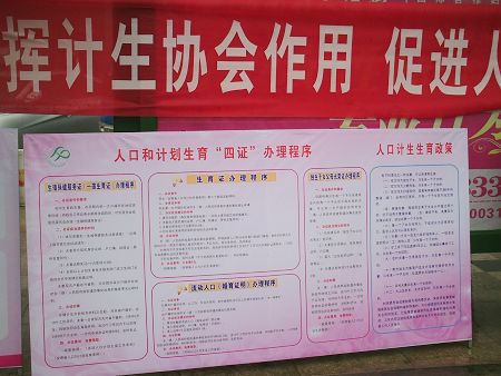 街道社区群众驻足观看计划生育宣传板牌 | 向群众免费发放计划生育避孕药具 |