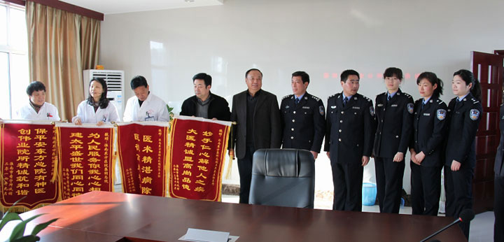 2014年1月24日上午,淮南市看守所于学文所长率领干警赴东方医院,送上四面锦旗慰问我院医务人员,对东方医院为市看守所收监人员提供医疗保障表示感谢!