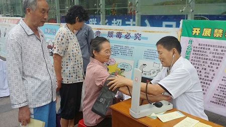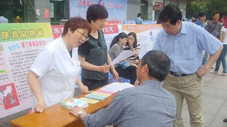 为了确保禁毒工作的各项措施落到实处,该院加大宣传力度,首先利用院内电子显示屏进行禁毒宣传标语滚动播放,力求每个来到医院的人都可以看到禁毒标语,在6月26日上午,由副院长孙玮同志带队组织医护人员在八公山紫金时代广场参加了八公山区“远离毒品—我们一起行动”禁毒宣传一条街活动。现场展示禁毒牌板3块,发放禁毒宣传材料50余份,重点宣传了毒品的基本知识和严重危害,让广大群众在了解毒品知识的同时,增强禁毒的信心和决心。为营造浓厚的宣传氛围,医护人员在现场为群众答疑解惑,进行义诊咨询服务百余人次。