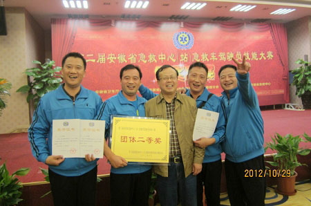 医院集团参加省急救中心急救车驾驶员技能大赛,三位选手都取得优异成绩。 其中韦伟获我市第一名。图为参赛选手与市120中心张传鹏主任合影庆祝 | 医院集团选手孙振雷在驾驶员急救技能比赛中 |