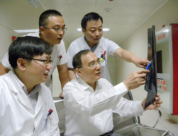 德高望重,具有三十多年放疗经验的治癌专家王琍先生(前右)和伙伴们一起探讨病情 |