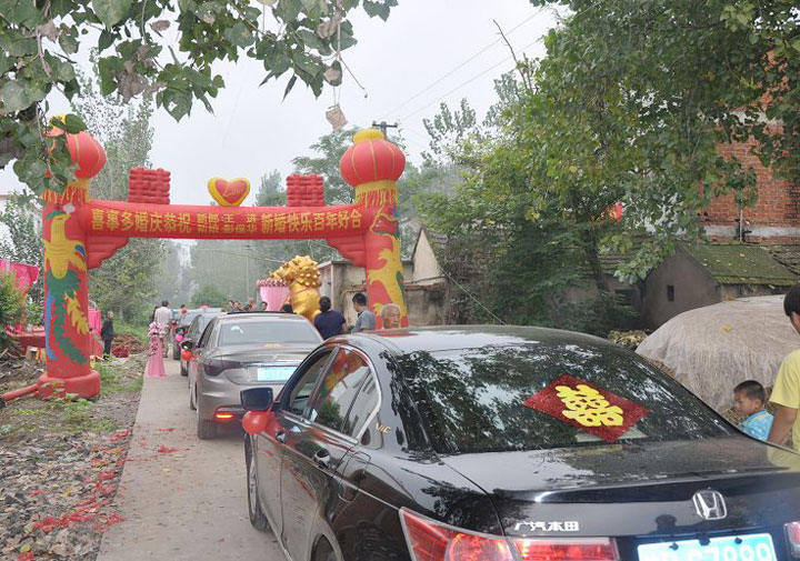 徐春晖、郝子龙、卜春玲、李瑞娟、陈琦、张芳、杨信、尹山等九人九部车,浩浩荡荡地向蒙城驶去。其中,李瑞娟和杨信两位的“宝马车”及张芳的“凌志”格外显眼。当车队驶进山区农村后,路面全是“狗头石”道路,高低不平,坑坑洼洼。李瑞娟的宝马被石头刮掉一块漆,大家都很心疼时,她却笑呵呵地一笑了之。车队行至凤台时,天下起了滂沱大雨,视线极差,但大家仍就打着双闪灯相互引导着,按时安全地完成了迎亲任务。这些,都让王进和他的新娘以及家人们感到无法用语言来表达的温暖与感激。当车队返回淮南时已经是下午四时了。