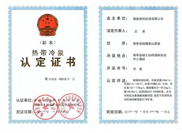 酒店热带冷泉认定证书 |