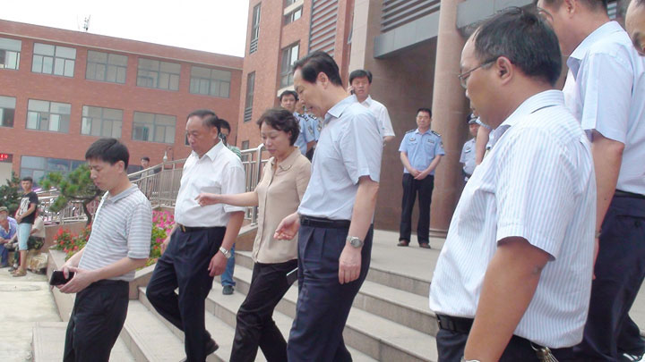 省委书记张宝顺(中)、淮南市委副书记、市长王宏神情凝重 |