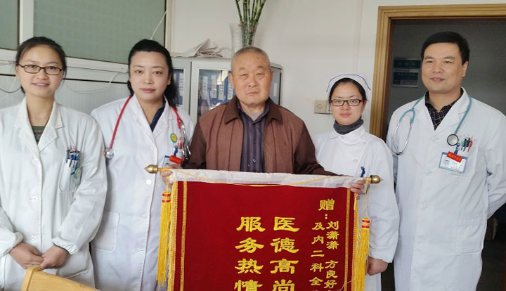 一个月后,徐伯伯康复出院了。在家人的陪伴下,他带着开心的笑容给内二科送来了锦旗,一声声的感谢让内二科这个大家庭充满了欢笑。