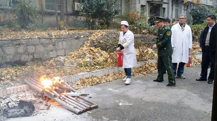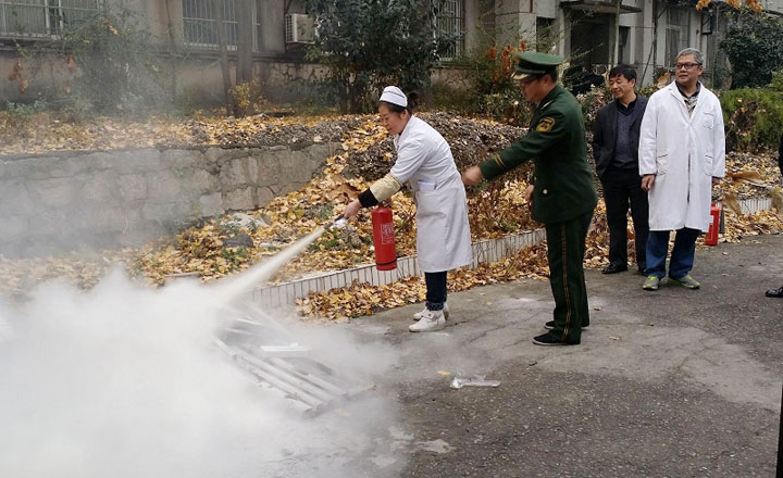 11月28日下午,医院领导还专门邀请八公山区消防大队的官兵来院开展了一次灭火器使用演练。院领导和各科主任、护士长、员工参加,演练在后楼北部空地进行,采用真实火源,由消防人员进行灭火操作演示,请各科室医务人员观看后让他们亲自操作,并在一旁指导。经过这次演练,医务人员扑救火灾的技能得到了很大提高。