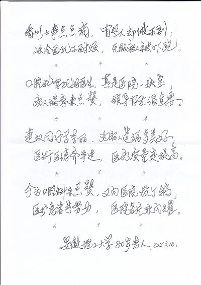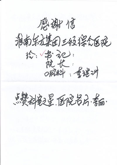 近日,东方总院口腔科收到了一封特殊的表扬信。说它特殊,不是因为它出自一位八旬老人之手,而是因为它工工整整的一笔一划书写,因为它表达了对医务人员最真挚的感情,因为它是一位老人用心写成。(原文如下)