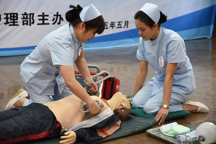 “呼吸心跳停止,立即急救”,在对“病人”身体进行探查并向评委汇报结果后,选手迅速为橡胶“病人”开放气道、进行胸部按压、电击……恢复心跳。专注认真的表情,规范熟练地操作,默契的配合不时博得阵阵掌声,许多护士纷纷举起手机留下这难忘的瞬间。台上比赛激烈、精彩纷呈,台下也是气氛紧张,由七个病区护士长组成的评委团队目不转睛地盯着选手的操作,生怕漏掉任何环节。