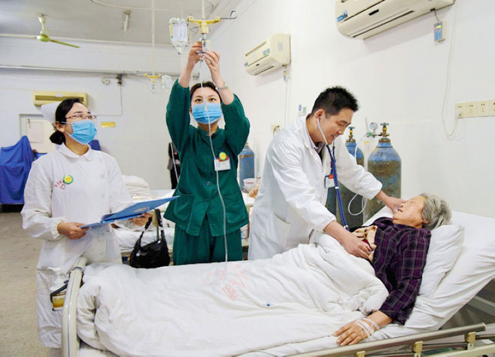 医生正在为张兴芝老人检查