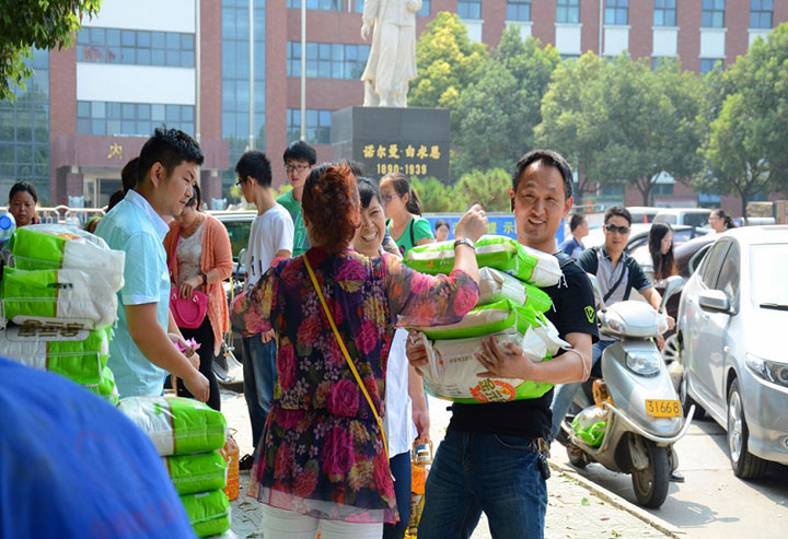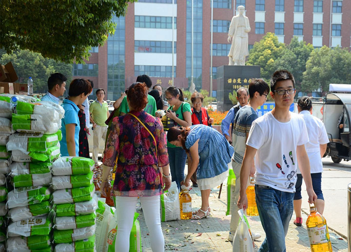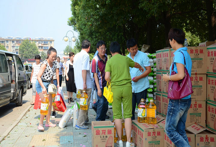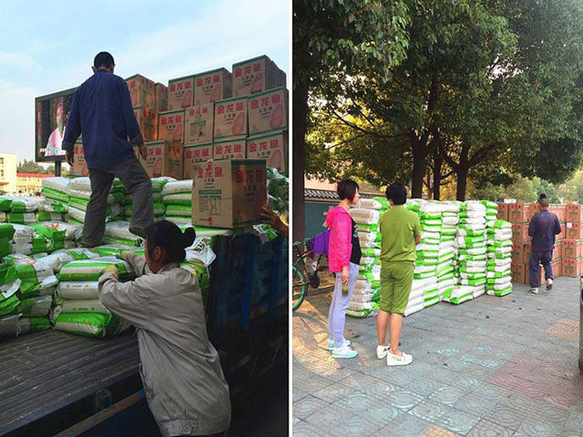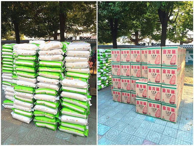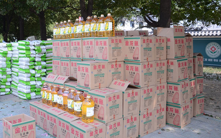 米油分发现场,热闹有序,时不时传来一陈爽朗的笑声