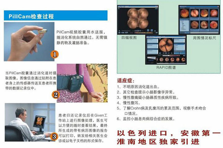 目前,淮南东方总院消化科使用的胶囊内镜是以色列生产的第二代产品,是目前全球检查小肠的最佳方法之一,受到广大患者的普遍欢迎。