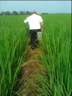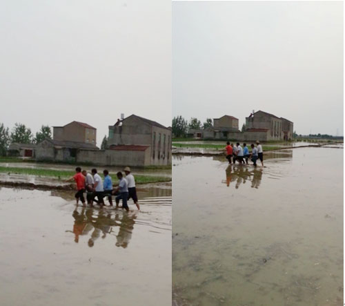 | 急诊科医护人员在稻田地中搬运患者 | 急诊科医护人员烈日下在田埂中赶往现场救助 |