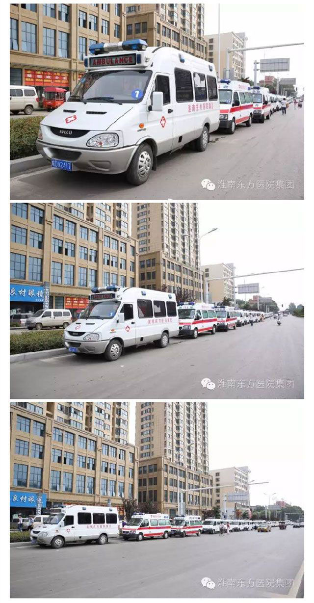 开诊庆典结束后,各医院调派的25辆救护车统一出发,在谢家集区的各条大道行进,为谢二医院的开诊宣传造势。