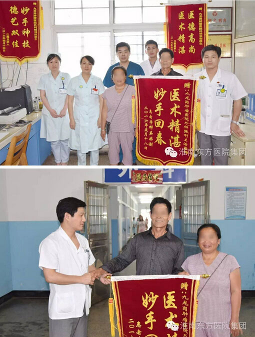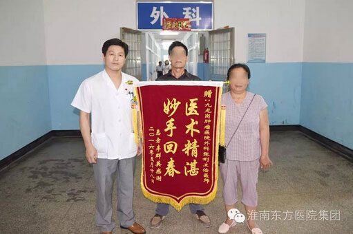 由于家庭条件非常困难,李女士生病后一直不敢就医,一直拖到难以维持生活才不得不到医院治疗。知道这些情况后,考虑到李女士的身体状况、病情需要等因素,每次入院治疗,外科医务人员总是给予她很多的帮助、支持及照顾。尽量选择治疗合理,效果良好的诊疗方案,尽可能地减少李女士及其家庭的经济负担。医护人员点点滴滴的关爱和照顾,令李女士全家铭记在心,每次说起,他们都会含着眼泪紧紧握住张利医生的手,一遍又一遍地说着感谢的话。经过半年的手术、化疗、放疗等综合治疗后,李女士即将康复出院。出院前,夫妻二人不顾张医生的阻拦,执意做了这面锦旗送到科室,以表全家的感激之情。