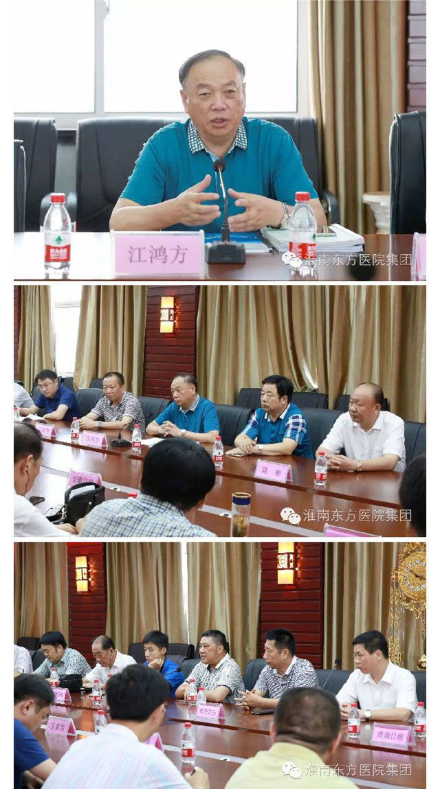 参观完毕后,医院集团江鸿方董事长、总院王多为院长、总院朱兴林书记、纪委陈彬书记、总院江永强副院长等领导班子成员与采风团成员进行了座谈。江鸿方董事长首先对采风团一行的到来表示了热烈欢迎,并向各位成员简要的介绍了医院集团重组改制、艰难创业、跨越发展的成长史。他介绍道——东方医院集团在没有一分钱政府补贴,没有一分钱企业赞助的前提下,持续发展成为目前安徽省最大的民营医院集团,主要利益于以下几点:一是勤俭创业。“历览前贤国与家,成由勤俭败由奢”,在设备采购、工程项目建设、大额药品、物资采购方面,我们坚持集体决策,最大程度保障医院集团利益和医院集团员工利益。二是科学管理。东方医院积极布点市场,先后收购多家企业破产医院,既为当地政府解决了难题,又通过改善硬件、软件,救活破产医院,加入东方后,原破产医院员工收入和幸福感大大提升,如今东方医院集团形成了健全的三级医疗网络,是“天然的医联体”,已占据淮南市医疗市场“半壁江山”。三是硬件到位。东方医院采购医疗设备时,始终遵循“目前最先进,五年不落伍”的原则,医院瞄准科技发展前沿,不惜血本引进世界顶级医疗设备,如奥林巴斯腹腔镜和即将引进的3.0磁共振、双源CT等,均是淮南市首家引进,目前东方医院硬件是淮南市最好的。四坚持技术创新。经过多年的发展,东方医院目前已逐步形成内科治疗外科化、外科治疗微创化的趋势。“三新”项目开展如火如荼,“两镜”及“三镜”联合治疗胆囊合并胆总管结石临床应用研究荣获淮南市科技进步二等奖,同时心血管内科、骨科、肿瘤治疗等方面都居于全市领先地位。五是服务温馨。“把伤病留下,把健康带走;把痛苦留下,把欢乐带走”是东方医院多年来始终不变的服务理念,东方医院不断优化服务理念,改善院内自然、人文环境,打造景观亮点,开展环山路演习,获得了社会高度评价。