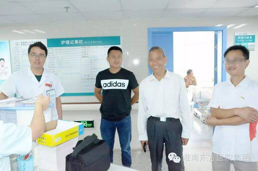 原来,他们是一家人。为首的是63岁涡阳新兴镇中心小学校长赵修付老爷子,他带着老伴、儿子、媳妇、女婿和还在怀抱的小孙子,从涡阳新兴镇赶来,特意向东方总院介入科送来锦旗。赵老父子满面笑容地说:我们一家六口,早上五点多天刚蒙蒙亮,就从家里出发了,把制作好的锦旗送给我的恩人——东方总院介入中心黄主任等医护人员。