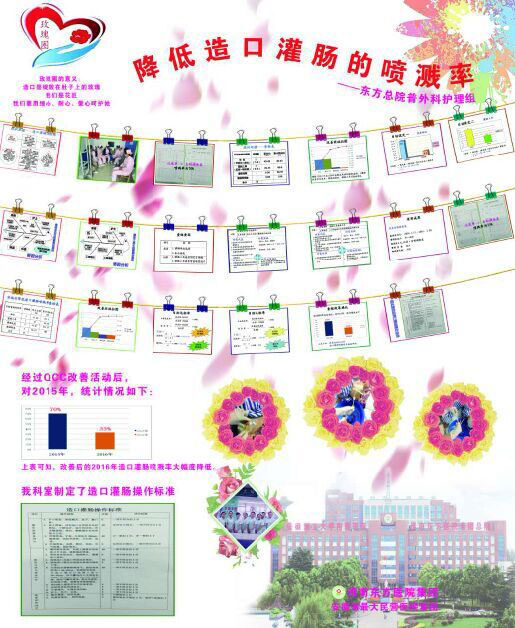 “一分耕耘一分收获”。 2016年安徽省护理质控中心第三届品管圈交流会上,东方总院普外护理组品管圈方案从60多个方案中脱颖而出,获得了壁报展示的机会,实现了东方总院在省内品管圈交流会议上 “零的突破”。 在 2016年安徽省质量控制年会上,普外科护理组向全省护理同仁充分展示了东方总院先进的护理质控理念和品管能力与技巧。虽然以降低造口灌肠喷溅率为主题的“玫瑰圈”品圈活动时间有限,但东方总院护理人为患者治顽疾、除病痛、谋幸福的实践永远在路上。