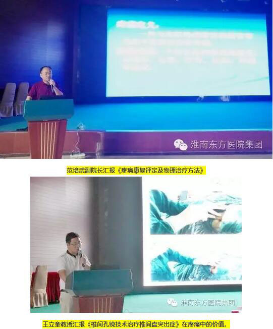 本次疼痛学术会议由范培武副院长,杜建生主任负责主持,出席这次会议的领导及专家有:安徽省疼痛学会前任主任委员,江淮名医、安医第一附院疼痛科前任主任陈家骅教授;安徽省医学会疼痛学分会第三届候任主任委员,中国医师协会疼痛医师专业委员会常委,安医第一附院疼痛科主任,博士王立奎教授;安徽省疼痛学会委员,中国医师协会疼痛专业委员会青年委员,安徽省疼痛学会秘书长,朱本藩;淮南市康复学会主任委员,东方医院集团总院副院长范培武教授、麻醉科朱满如主任;淮南市麻醉学会主任委员,朝阳医院麻醉科刘春宏主任。