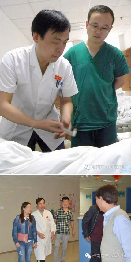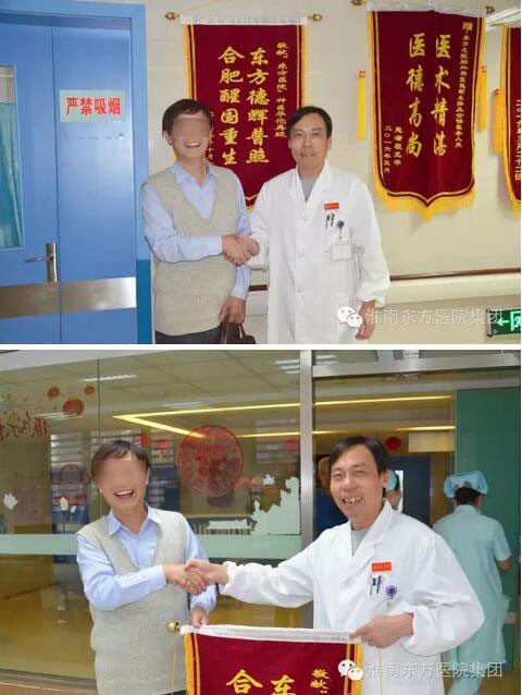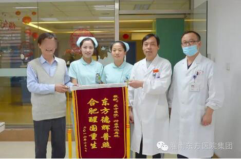 无独有偶,另一位病人的情况同样为我市的神经外科抢救史增添了浓墨重彩的一笔。一位年轻的小伙子,年仅27岁,因过于劳累,于5月23日,因公负伤,从长丰县人民医院转至东方总院进行抢救。这位病人来到医院时,已经昏迷、瞳孔散大,生命垂危,颅内出血量约120ml,同时有颅骨大范围骨折,累及上矢状窦大血管。经过紧急诊断后,张德辉主任为该病人进行了急诊全麻下“颅内血肿清除十去骨瓣减压术”。术后,小伙子瞳孔恢复正常,生命体征逐渐平稳,进入重症监护室进行术后观察和抢救。此后,安医一附院程宏伟主任来查看该病人的情况,程主任评价总院神经外科急救及时、手术非常成功。尽管病人的颅内出血量较大,但恢复的几率也很大。术后第二天,病人复苏,并向陪护的亲人清晰而又连续地表达道:我要上班;我怎么受伤了;今天是什么时候……听到这三句完整的话语,他陪护的老爸大喜过望——儿子醒来了,培养了多年的儿子智力上没受到影响。经过近五个月的康复,小伙子已完全康复,可以正常上班。这位在安徽省教育界辛勤耕耘并深孚众望的教育工作者事后感激地说,在东方总院,是“救死”,在合肥的医院,是“扶伤”。对于东方总院第一时间的抢救,他无限感激地说,就像得到了一个“小二子”一样快活。时过5个月,国庆假日期间,老教师专程从合肥赶来向张德辉主任和全体医护人员们送来了一幅充满寓意的锦旗:“东方德辉普照,合肥醒国重生”。把张德辉主任和病人的名字嵌于对联中,以表达他最诚挚的感谢。