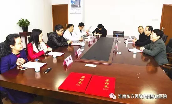 在蚌医一附院会议室,双方首先就各自医院目前发展情况,合作意愿进行了简短交流。王洪巨院长对蚌医一附院近年来在人才引进、分级诊疗、绩效改革等方面工作进行了阐述,表示,淮南东方医院集团与蚌医一附院有着先天的区位优势,在医院管理、技术合作、人才交流等方面有着很大的合作潜力,希望双方可以在上述领域开展合作与交流。詹一朝副院长紧接着介绍了淮南东方医院集团的概况,重点阐述了集团医院运作中分级诊疗的内部推进经验以及对医联体合作的学科诉求。何群副院长也向与会人员介绍了肿瘤医院在肿瘤诊断、治疗、技术开展等方面的情况,并强调,蚌医一附院也是蚌医附属肿瘤医院,在肿瘤诊治技术与项目开展中具有高度的重合性,希望两家医院可以在肿瘤诊疗方面加强合作,不断提高医疗服务能力和服务质量。