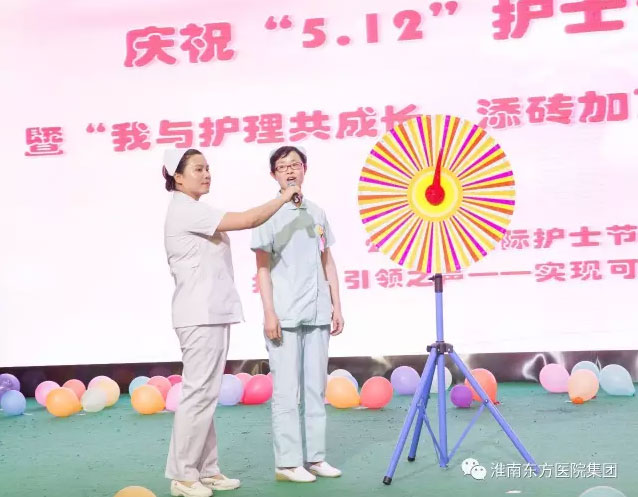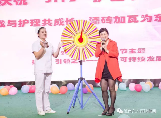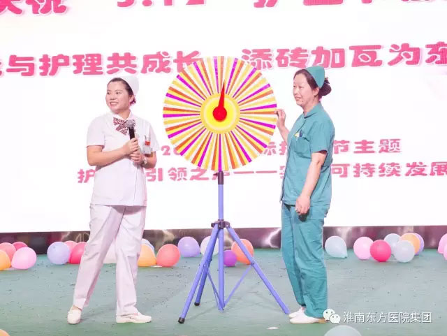 在紧张的统分过程中,活动穿插了一个名叫“幸运大转盘”的互动游戏,并邀请医院领导、总院资深护士代表、基层护士代表、实习生代表为大家转动幸运大转盘。很多礼品幸运地花落各家,大家玩得兴高采烈,现场气氛再一次被推向了高潮。