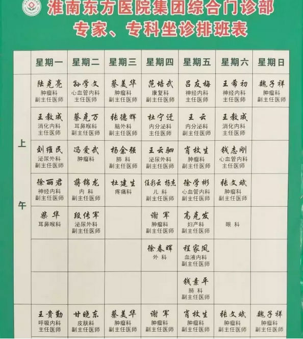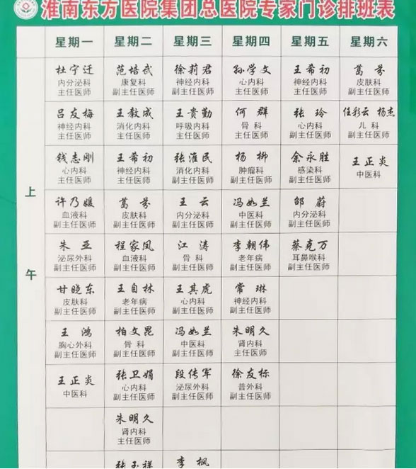 总院和综合门诊(火车站苏果斜对面)的专家门诊排班表