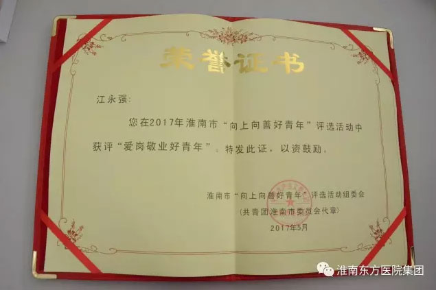 5月4日下午,淮南市庆祝建团95周年暨“向上向善好青年”颁奖典礼在淮南市广播电视台演播大厅举行。会上,东方医院集团总院副院长江永强同志喜获“向上向善好青年”荣誉称号。市委副书记王崧同志亲自为江永强颁奖,并给予勉励。