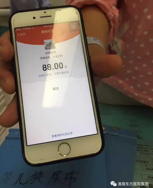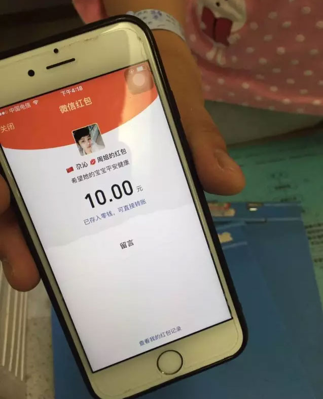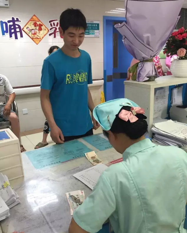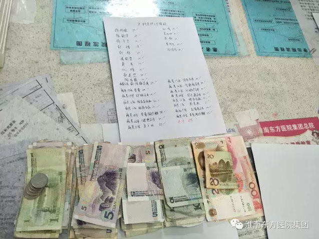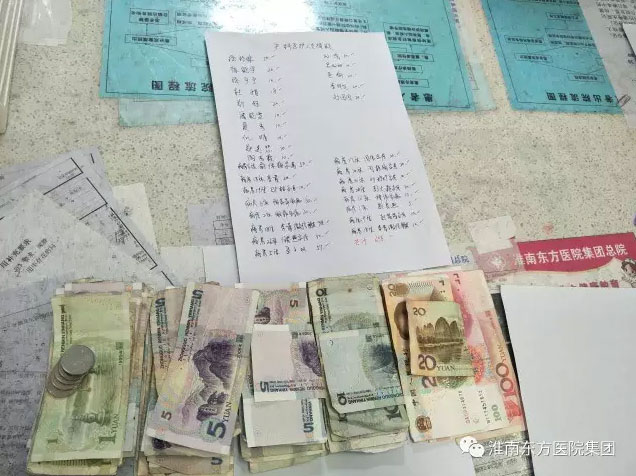 由于来的匆忙,产妇连裤子和鞋子都没穿,徐玲妹护士长热心地为她送去鞋子、裤子。看着他们的窘境,医护人员们心里很不是滋味。徐玲妹护士长提议:我们的值班人员为他们一家三口捐点钱,让他们吃口热饭,有回家的路费。徐护士长先捐 50元,在她的带动下,值班的医护人员们纷纷伸出援助之手——陈晓宇、徐宁宁、杜鹃、郑钰、潘晓雯、夏秀、倪娟、郑美慧、陶秀霞、吴双双、邑梅、李成芝、孙彧、刘园园等,你三十,我二十,一会儿就凑了几百元。听闻这家人的困境后,总院副院长江永强毫不犹豫地捐了五百元,重症监护室的刘朔护士长从微信发去善款,请在场的朋友代捐。医护人员捐款的同时,产科病区的其他孕产妇和家人们深受感染,也纷纷献出爱心,捐钱的、捐衣服的、捐鸡蛋、奶粉的……对每一笔捐款,细心的徐护士长都安排好专门人员进行整理登记。