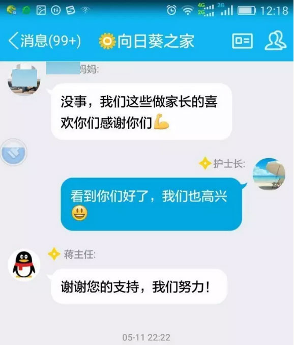 对于以上种种问题,淮南东方总院烧伤科医护人员为了更好的帮助和解决病人的问题做到以病人为中心,细心贴心地对待每一位门诊或住院、在院或出院的患者。他们建立了名为“向日葵之家”的烧伤医患病友QQ群,他们的口号是“我们在病房是病友,在群里是朋友。没事聊天,有事您说”他们不仅说到而且做到了多年如一日的在群里为患者积极解答难题和困惑、鼓励和安抚患者情绪、主动向患者宣教烧伤护理的相关知识,温情的关心患者的出院恢复情况......烧伤科的蒋新安主任,为了能更好的帮助服务患者参与群里互动,特别的自己花钱将用了多年的老式功能手机换成了智能手机。并带领周伟医生及其他医护人员们坚持每天签到,随时在线回复、沟通、回访病人。两年来不断地为病友答疑解惑,做到了为患者从住院到出院后的全方位服务,使病人感到如同亲人般的温暖。该群自2015年建群以来,成员已经多达65人,得到病人及家属的一致好评。每当节日里,他们都经常在群里给烧伤科的医护人员们送来节日的祝福。还有的病人在出院以后特意来医院看望医护人员以表达他们的感激之情。烧伤科病房里还有一面温馨的照片墙记录了患者们和医护人员的幸福时刻,每一个走过照片墙的人,看着一张张孩子们可爱的笑脸和一些励志的便签,都能感受到春天般的温暖。