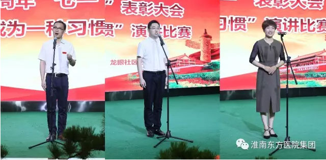 “让责任成为一种习惯”演讲比赛首先举行。经过层层选拔,各医院共派出了十名代表参加了本次比赛。参赛选手紧扣主题,用朴实的语言,从不同侧面,不同角度结合医院工作实际,把一件件发生在自己身边真实、生动、鲜活、感人至深的故事通过演讲展示出来,展现了医院集团广大医务人员在各个岗位上保障健康、提升服务、履职尽责、艰苦奉献的先进人物事迹和工作成效,尽情诠释了“白衣天使”的本色,弘扬了正气,凝聚了人心,鼓舞了士气,赢得了在场观众一次次热烈的掌声。经过认真的评选,最终,李一医院黄梦清获一等奖,田东医院黄贝贝、眼科医院金杨获二等奖;李一医院岳月、总院内科支部沈建峰、凤凰医院孙雪婷、淮化医院顾芸获三等奖,新庄孜医院张芝龙、凤凰医院马静、总院机关支部徐潜获优秀奖。