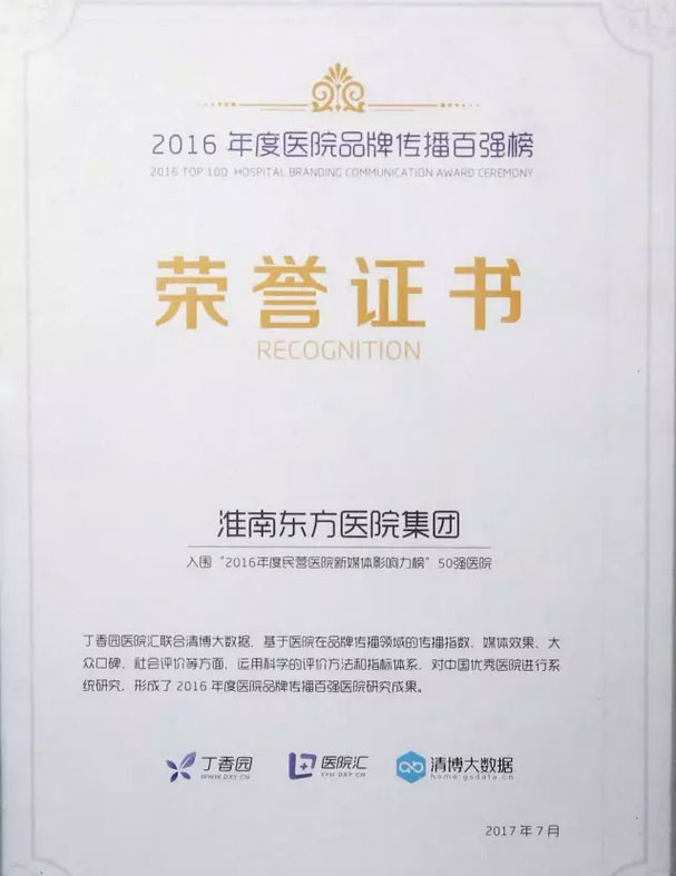 发展大会上,淮南东方医院集团荣登“2016年度民营医院品牌传播百强榜”,同时入围“2016年民营医院新媒体影响力榜”50强医院,为集团厚厚的荣誉史上,再次添上浓墨重彩的新篇章。
