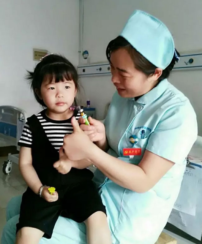 在我们耐心细致的安慰鼓励下,刚刚还哭鼻子,不愿意打针的小姑娘勇敢地伸出了自己的小手,主动让护士阿姨给她打针呢!