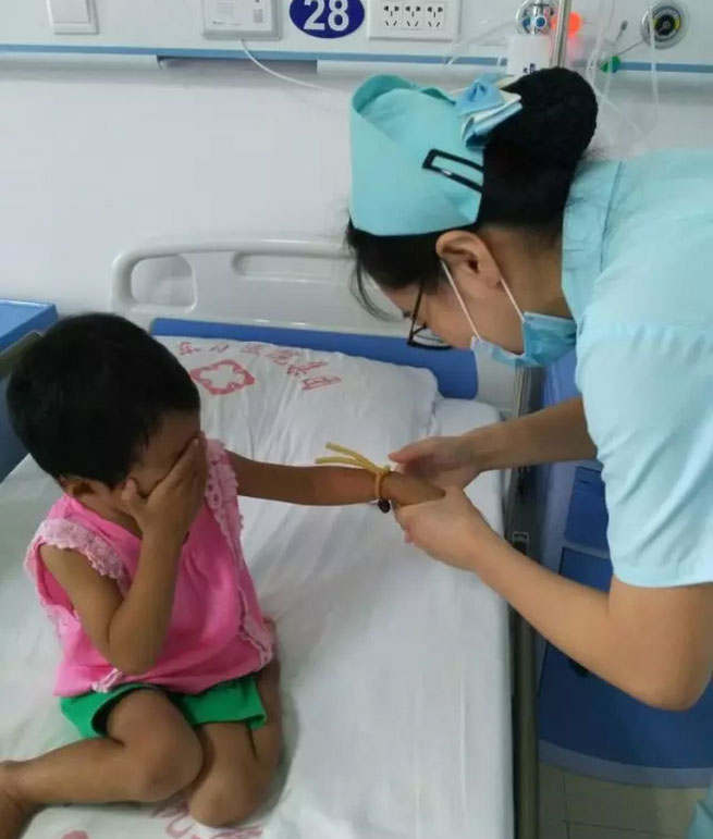 患儿因生病离开熟悉的生活环境,到陌生的环境中接受治疗,容易紧张不安,哭闹不合作。这就需要我们护士和言悦色,耐心地安慰,帮助患儿消除恐惧紧张心理。
